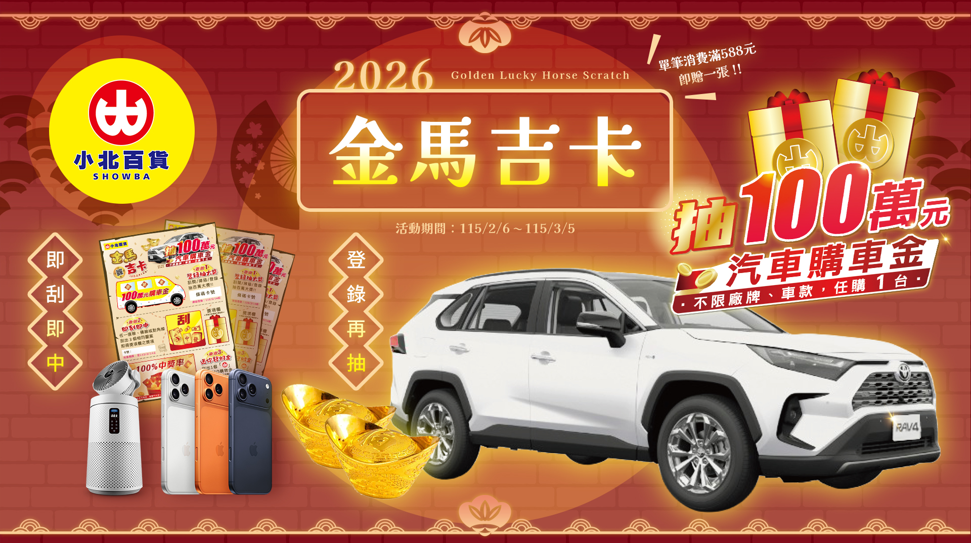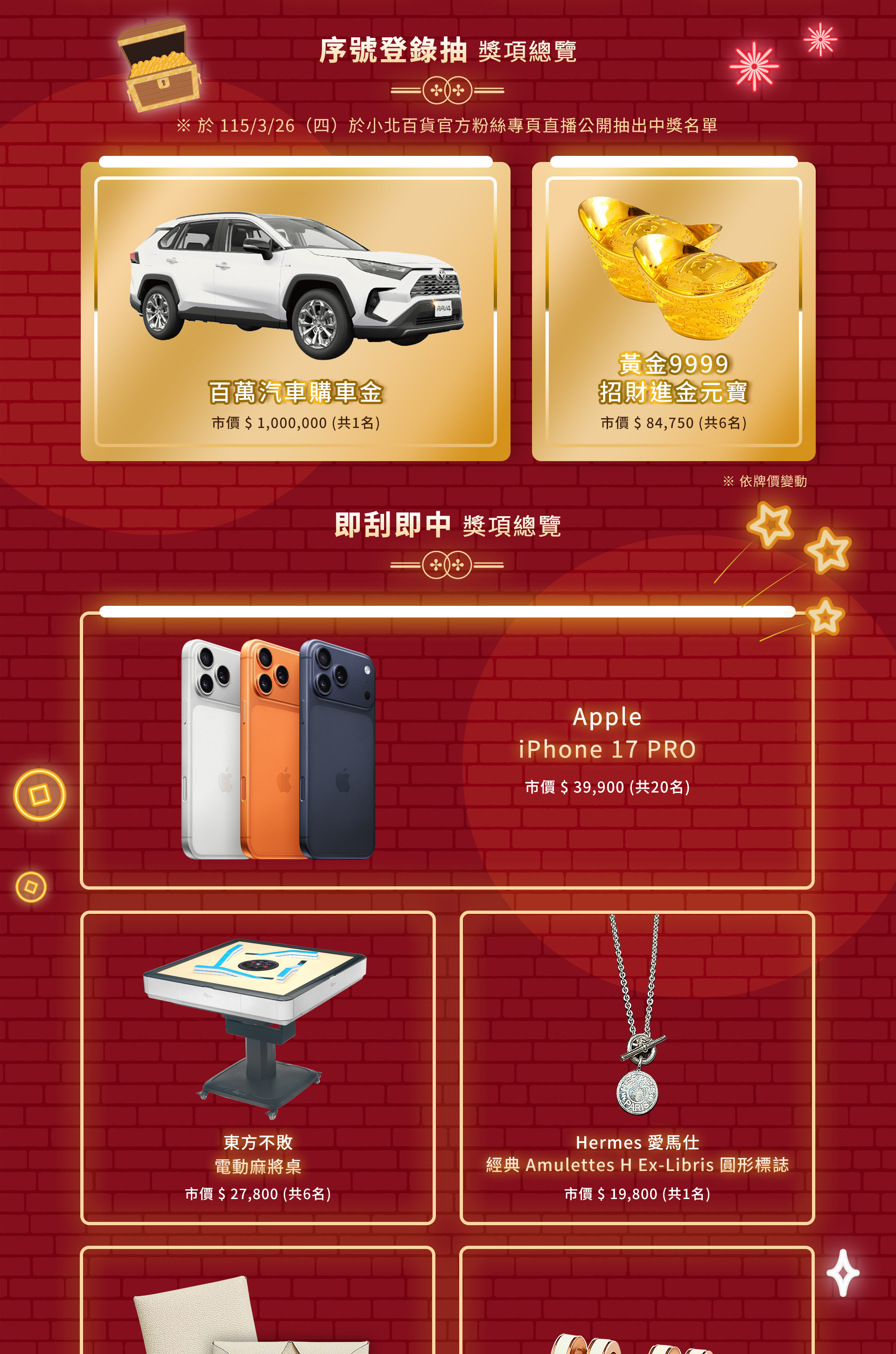 特獎中獎名單將於 115/3/26(四)抽出。中獎名單於 115/3/27(五)公佈於小北百貨全台門市、官方網站及 Facebook 粉絲專頁。