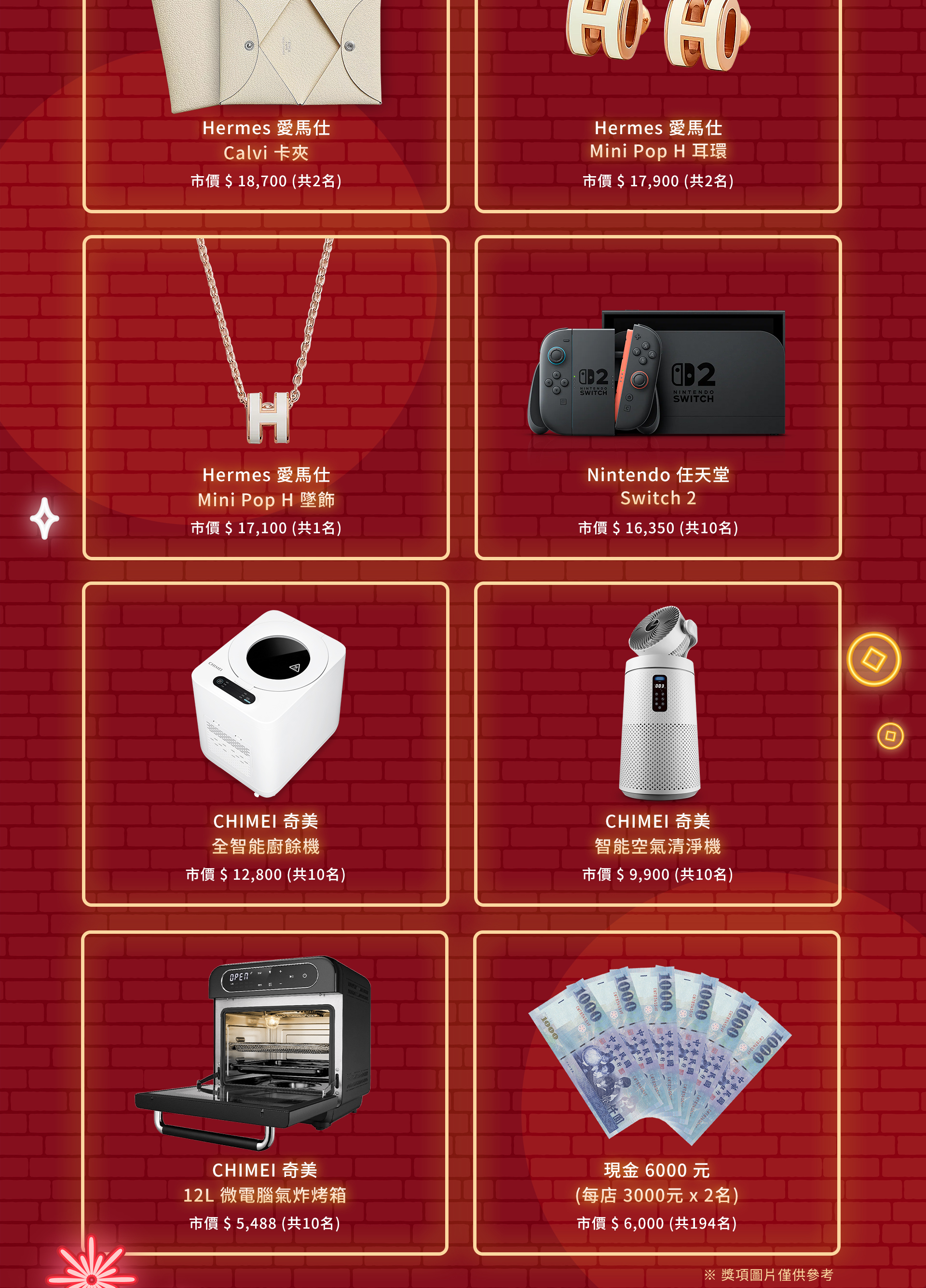 Prize delivery is limited to Taiwan’s main island. Locations without elevators will receive delivery to the first floor only.